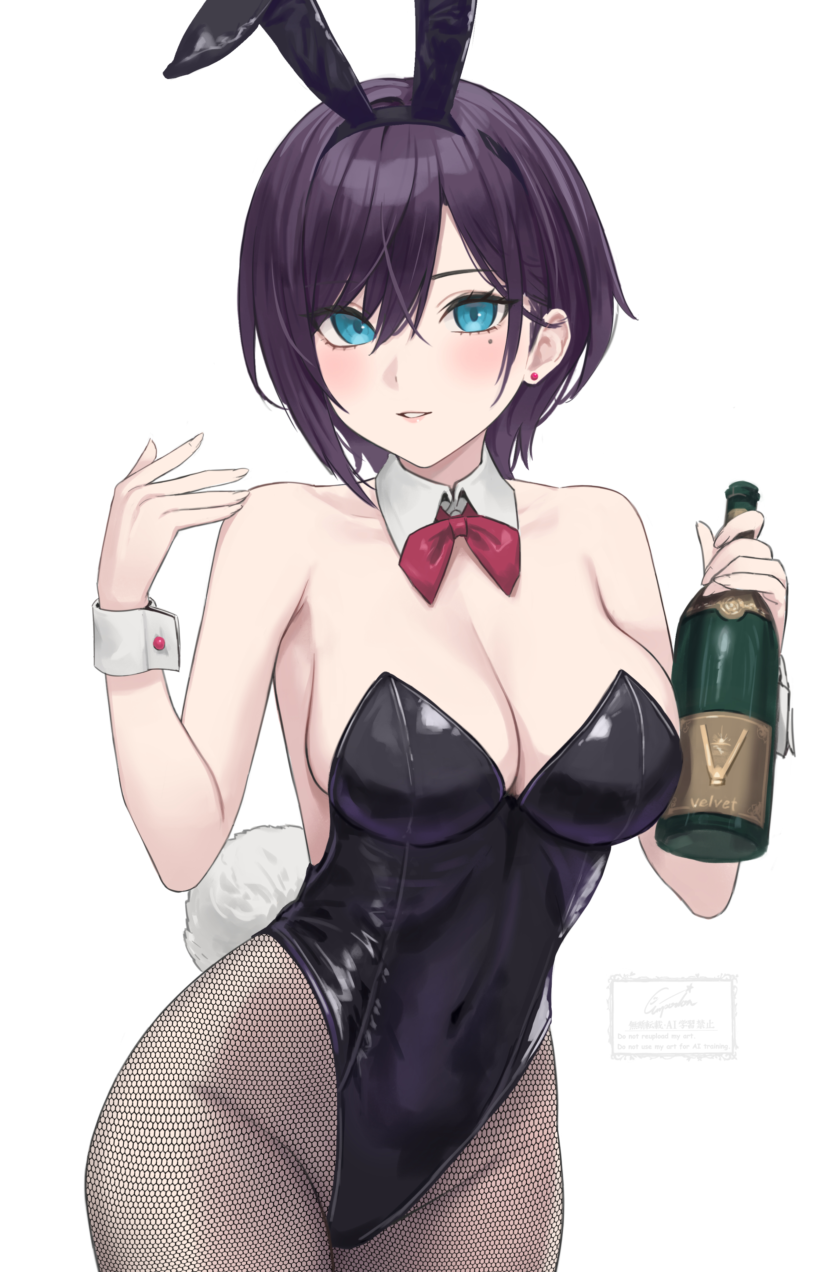 1girlanimal ear hairbandanimal earsblack hairblack leotardblue eyesbowbowtiebreastscleavagedetached collarfake animal earsfishnet pantyhosefishnetshair between eyeshairbandlarge breastsleotardpantyhoseplayboy bunnyrabbit earsrabbit tailred bowred bowtieshort hairsimple backgroundsolostraplessstrapless leotardswept bangstailtraditional bowtiewhite backgroundwrist cuffs