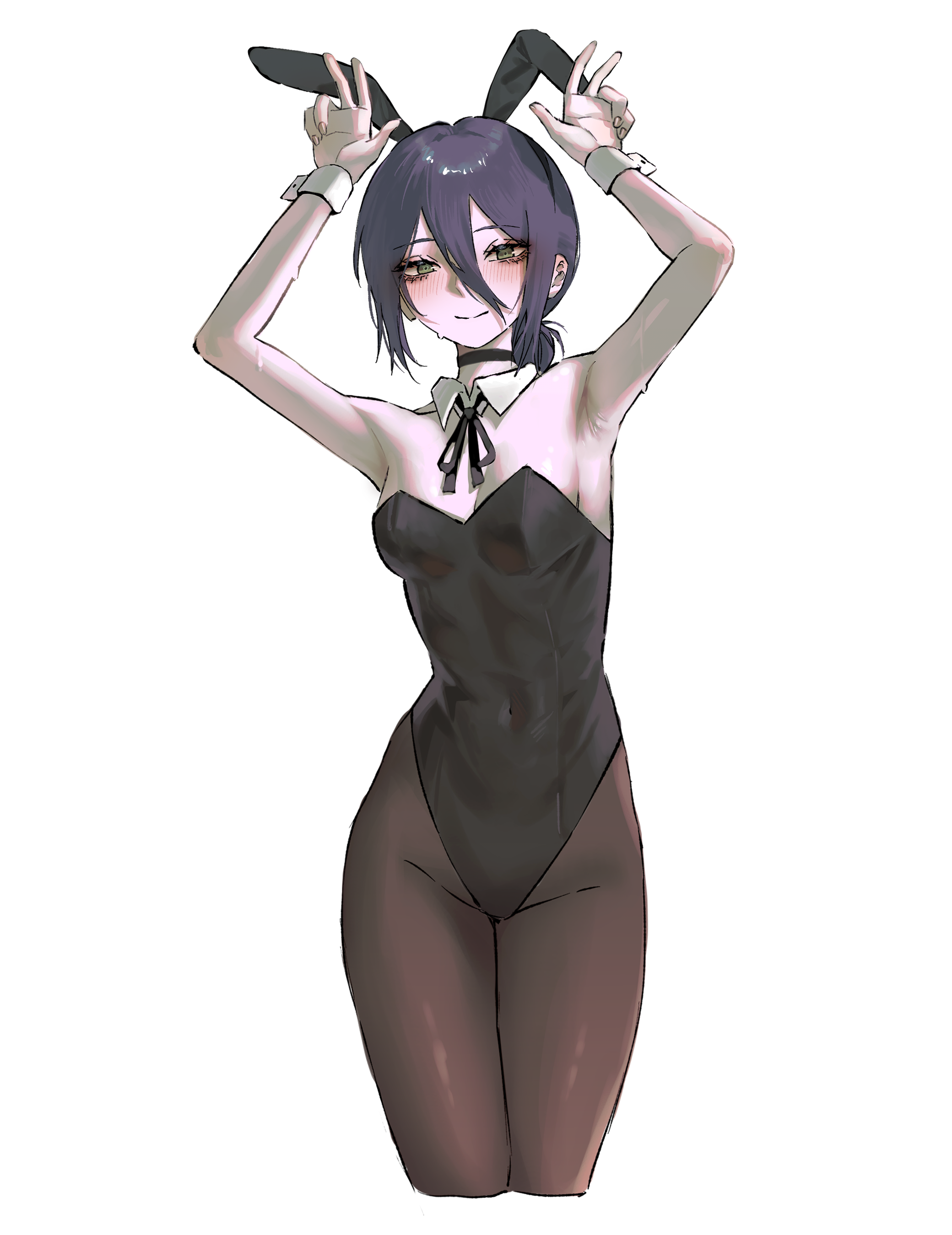 1girlalternate costumeanimal earsarmpitsarms upblack chokerblack leotardblack ribbonbreastsbrown pantyhosechokerdetached collarfake animal earsgrey eyeshair between eyeshair bunleotardlooking at viewerneck ribbonpantyhoseplayboy bunnypurple hairrabbit earsribbonsimple backgroundsmall breastssolostraplessstrapless leotardsweatwhite backgroundwrist cuffs