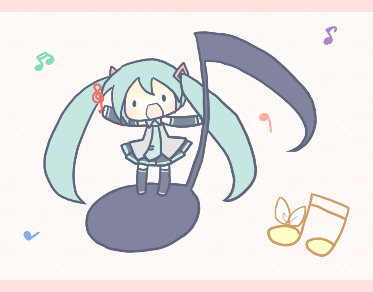 1girlaqua hairchibidetached sleevesfemale focuslong hairmusical notenecktiequaverskirtsolothighhighstreble cleftwintailszettai ryouiki