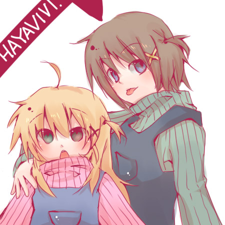 00s2girlsahogeblue eyesbrown hairgreen eyeshair ornamentlooking at viewermultiple girlssimple backgroundupper bodywhite backgroundx hair ornament