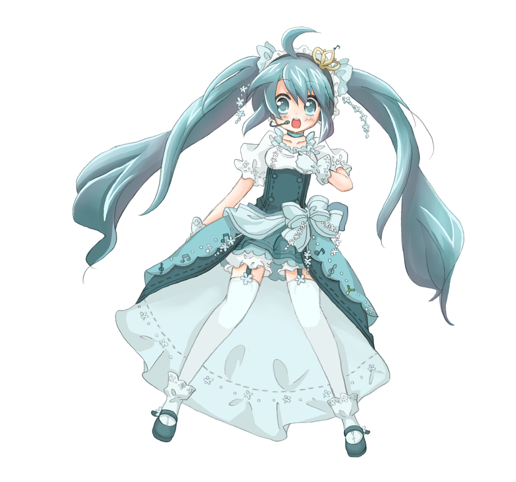 :oahogeaqua eyesaqua hairblushchilddressgarter strapsglovesheadsetlong hairopen mouthsolothighhighstwintails