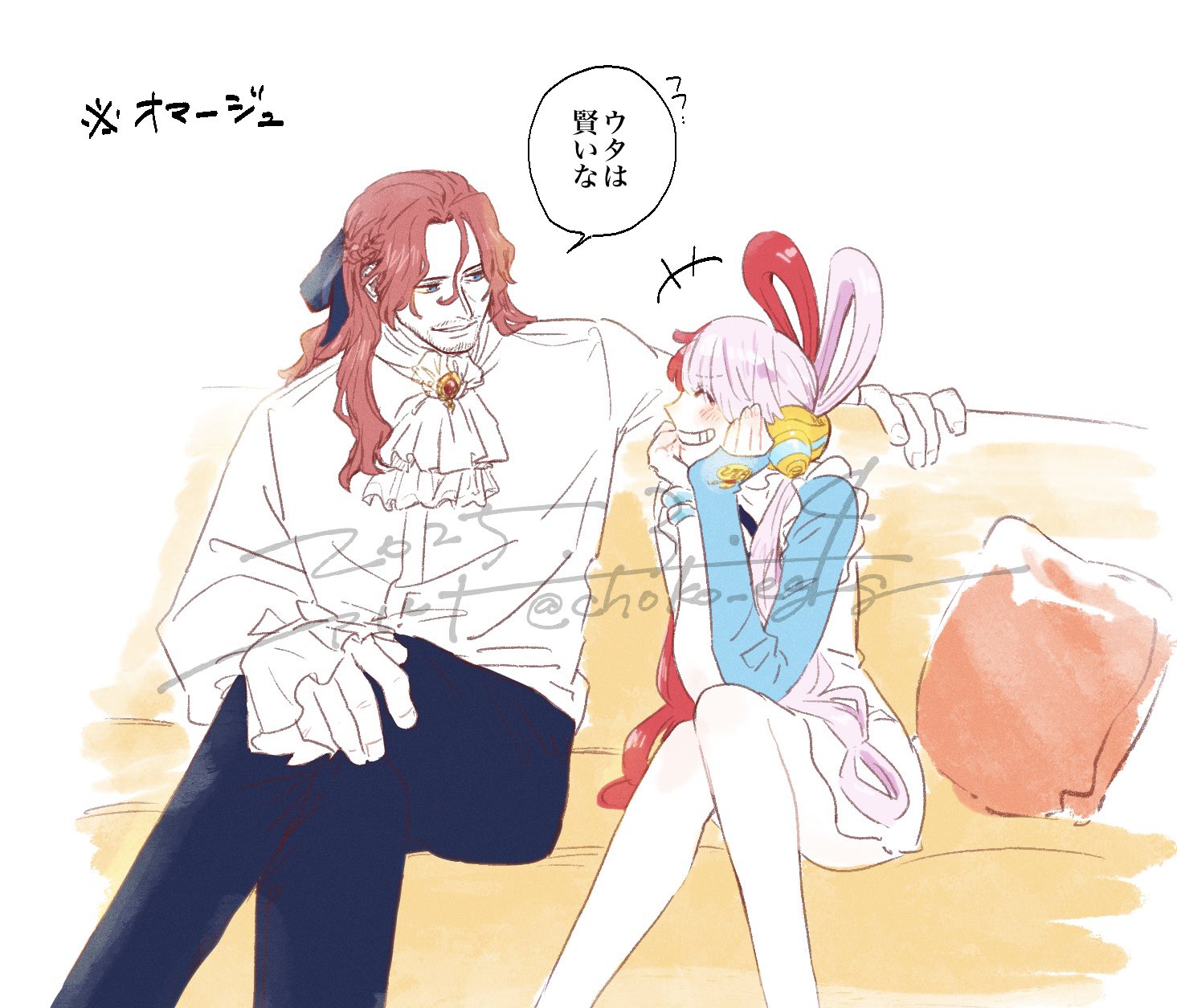 1boy1girlblue eyesblushcollared shirtdressfacial hairlong hairlooking at anothermulticolored hairmultiple boyspurple eyesred eyesred hairshaded faceshirtshort hairsiblingstwo-tone hairuncle and niecewhite backgroundwhite dresswhite hairwhite shirt