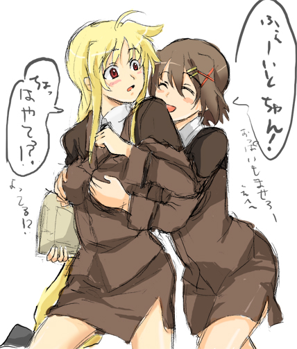 00s2girlsblonde hairblushbreastsbrown hairclosed eyesdrunkgrabbing another's breastgropinghair ornamenthaircliphuglong hairmultiple girlsno legwearopen mouthpencil skirtred eyesribbonshort hairsketchskirtx hair ornament
