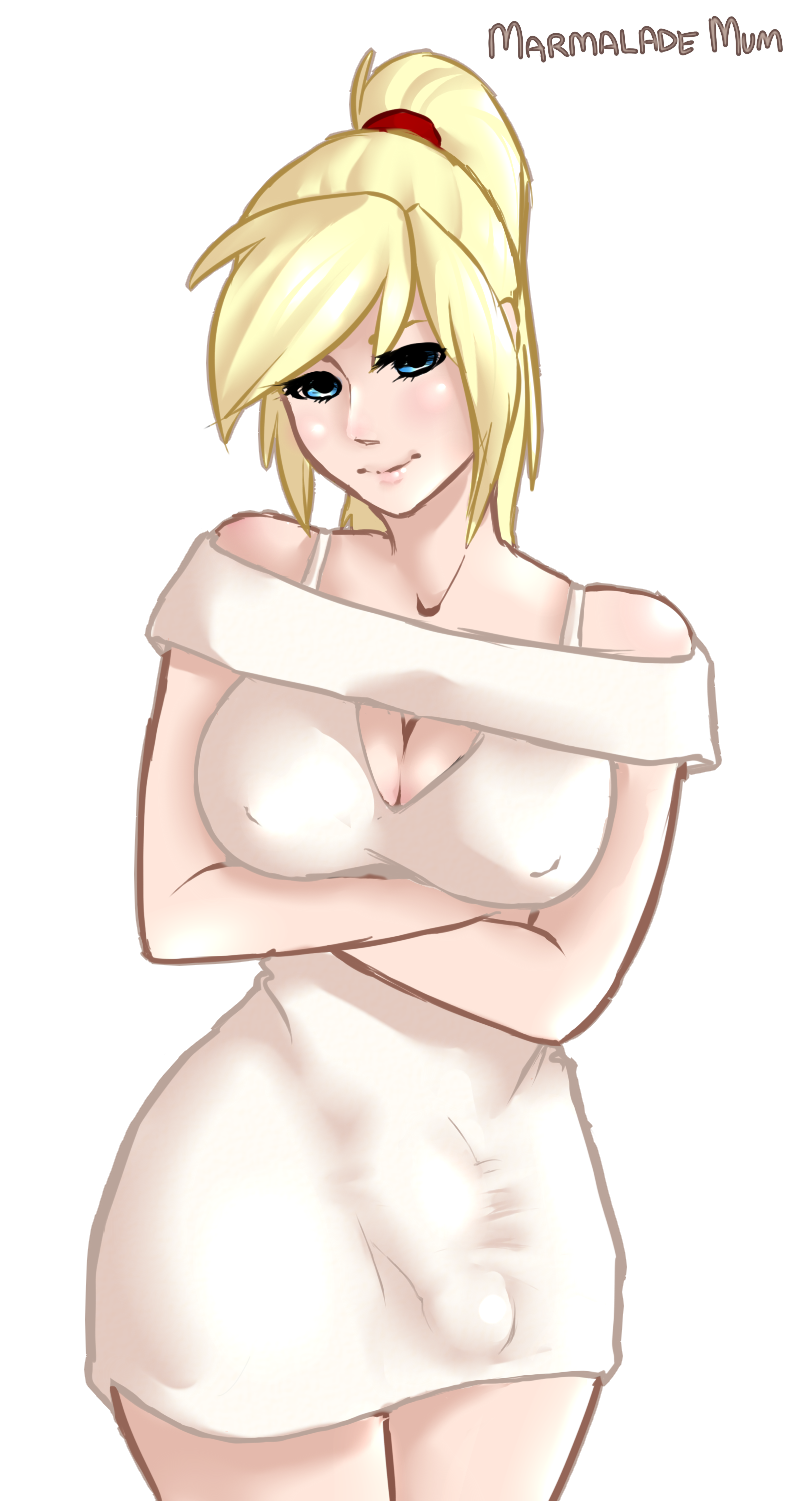alternate costumeblonde hairblue eyesbreastsbulgecameltailcenter openingcleavagecrossed armsdresserection under clothesFlag for Deletionfutanariintersexlong hairlooking at viewerpenis under dressponytailsmiletied hairwhite dress