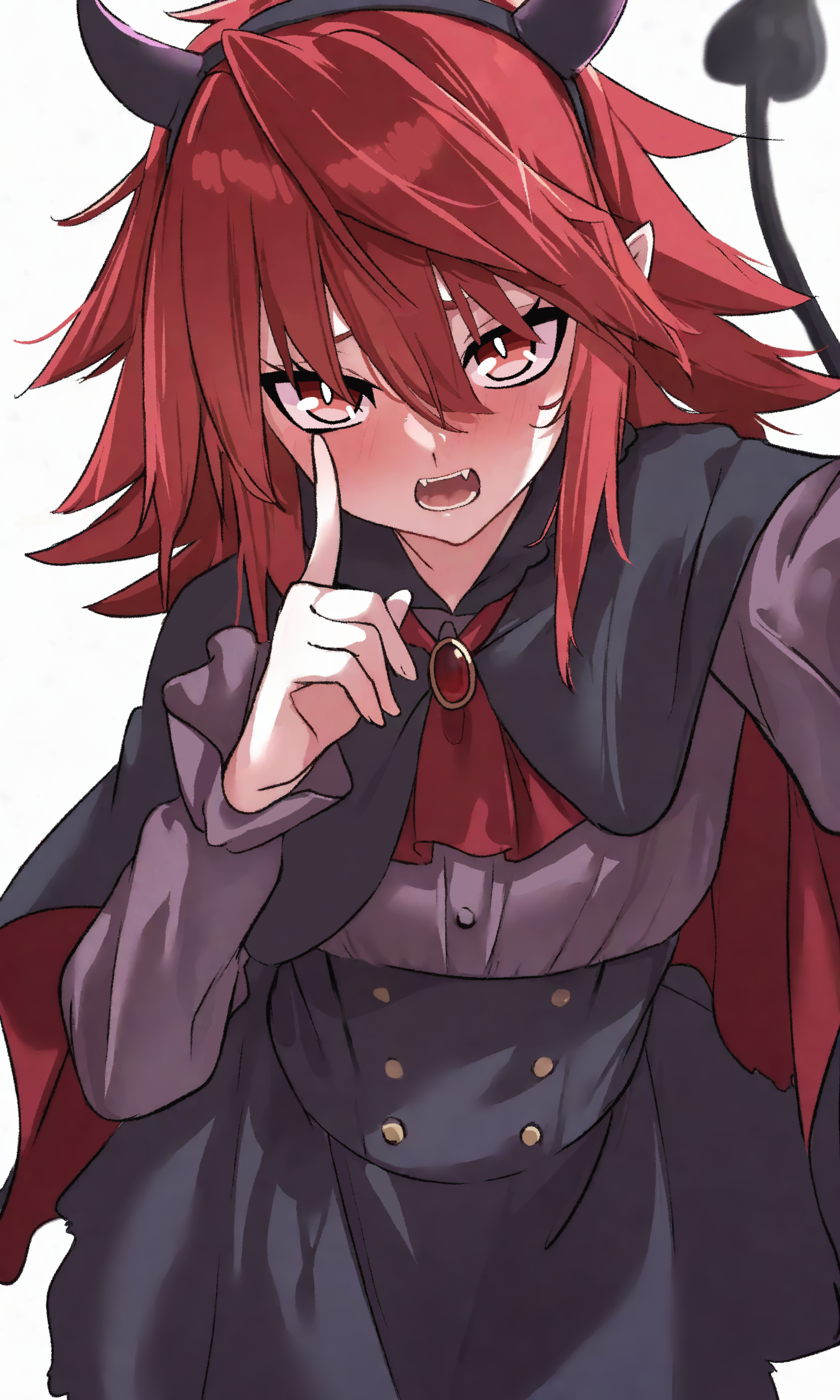 1girlalternate costumeascotblushbuttonscapeletdemon girldemon hornsdouble-breastedduel monsterfake hornsfake tailhalloween costumehand uphigh-waist skirthornslong hairlong sleevesred eyesred hairshirtskirtsolotail