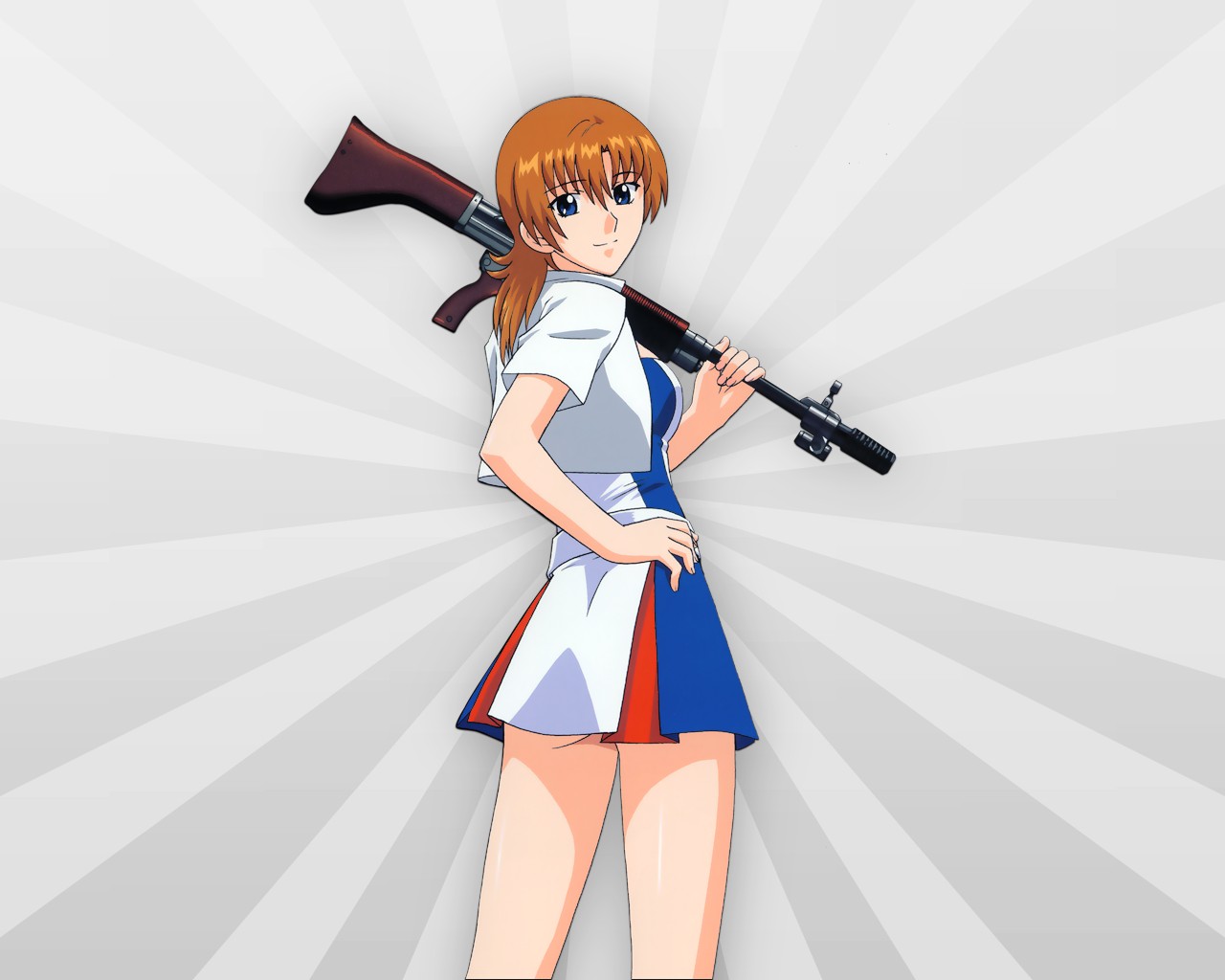 00s1girlautomatic riflebattle rifleblue eyesbrown hairfemale focusfg42gunhand on own hiphip focusrifleskirtsmilesolostandingweapon