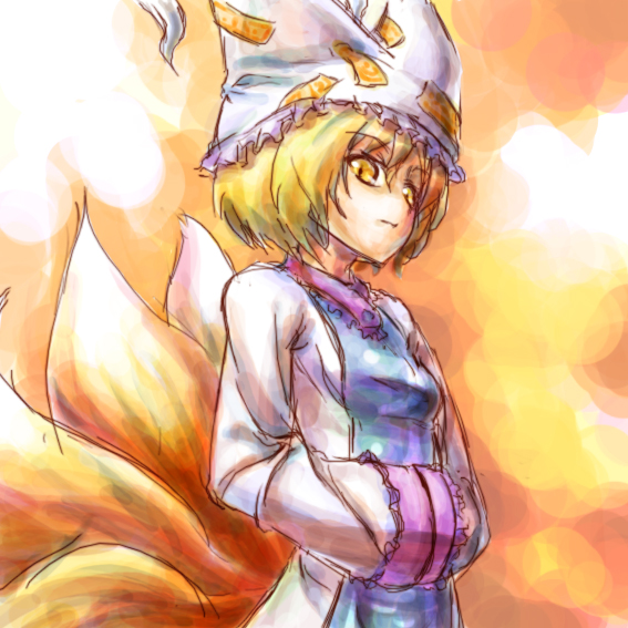 1girlanimal hatblonde hairfemale focushands in opposite sleeveshatlong sleevesmob capmultiple tailsshort hairsolotailtasselwide sleevesyellow eyes