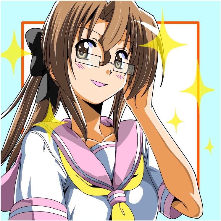 udon inuki, izumi konata, lucky star, highres, 1girl, ahoge, blue hair, brown shoes, brown socks, green eyes, long hair, mole, mole under eye, neckerchief, pink neckerchief, pleated skirt, red sailor collar, red skirt, red sleeve cuffs, sailor collar, school uniform, serafuku, shirt, shoes, simple background, skirt, socks, w, white background, white shirt