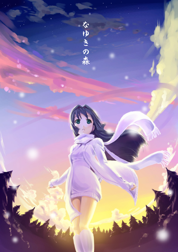 1girlblue haircloudfemale focusforestgreen eyeslong hairlooking afarnaturescarfskysolosunsettree