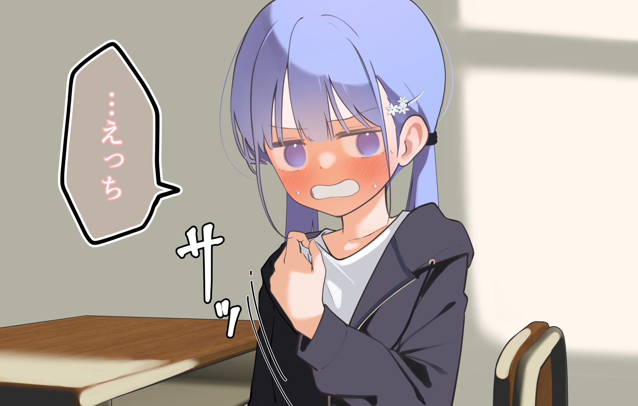 1girlblack jacketblue hairblushchairhair ornamentindoorsjacketlong hairlong sleevesparted lipspurple eyespurple hairshirtsolotwintailswhite shirt