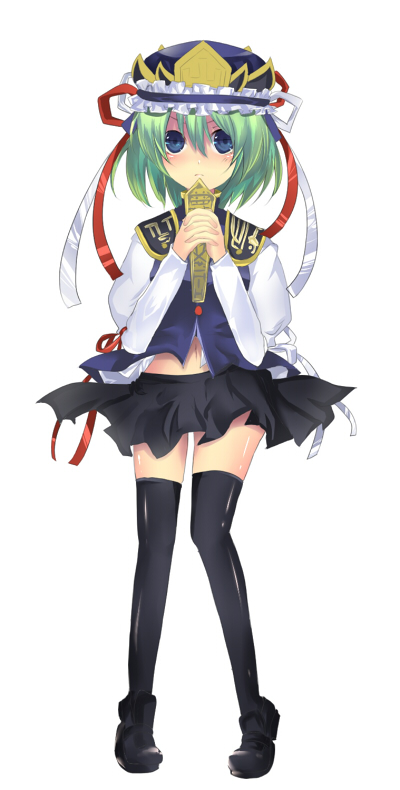 1girlblue eyesblushfemale focusfull bodygreen hairhatribbonrod of remorseshort hairsimple backgroundsolostandingthighhighswhite background