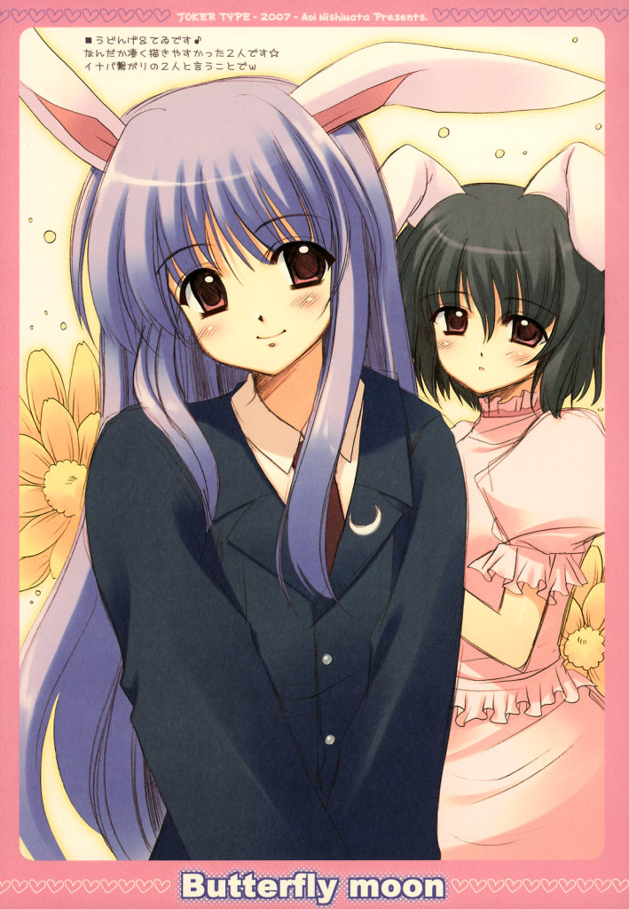 2girlsanimal earsblack hairblushfemale focusflowerlong hairmultiple girlspurple hairrabbit earsshort hair