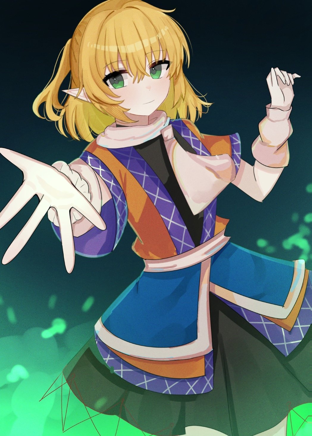 1girlascotblonde hairgradient backgroundgreen eyeslooking at viewermedium hairpointy earsreachingreaching towards viewersolowhite ascotwrist cuffs