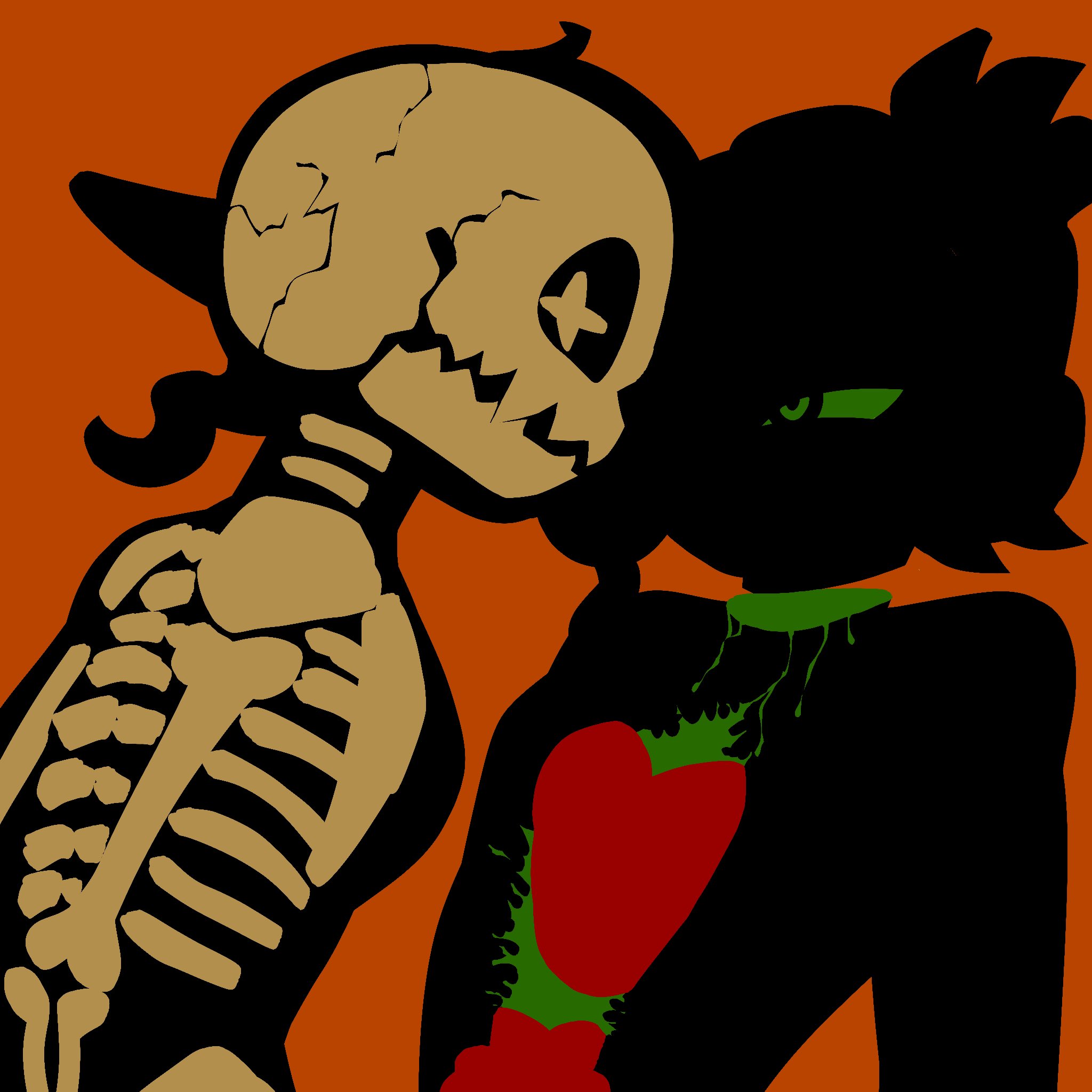 2girlsbloodblood on chestbreastscolored scleracracked skulldisembodied headeyed silhouettefanggreen bloodgreen pupilsgreen scleraheartinklingleaning forwardlooking at anothermultiple girlsoctolingorange backgroundpointy earssevered torsosilhouetteskeletonstar (symbol)symbolismupper bodyx-ray
