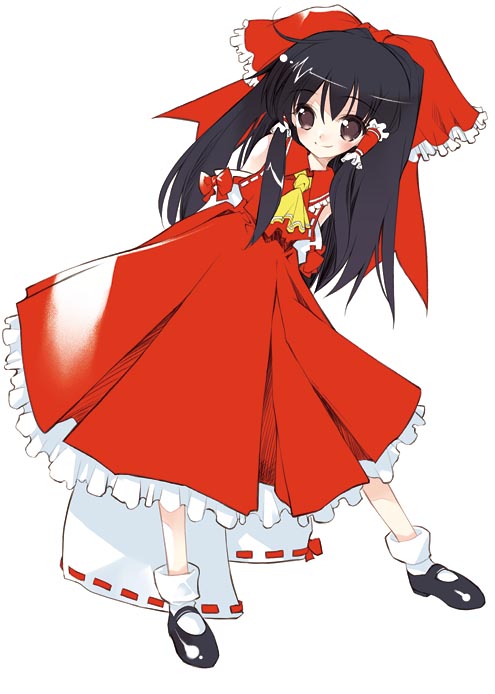 1girlarms behind backblack hairbrown eyesfemale focusjapanese clothesleaninglong hairmikosimple backgroundsmilesolowide sleeves