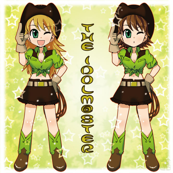 00s2girlsblonde hairbootsbrown haircowboy hatcowboy westerndual personafringe trimfull bodyglovesgreen eyeshatlong hairmidriffmultiple girlsone eye closedropeshirtshort hairsleeves rolled uptied shirttime paradoxwink