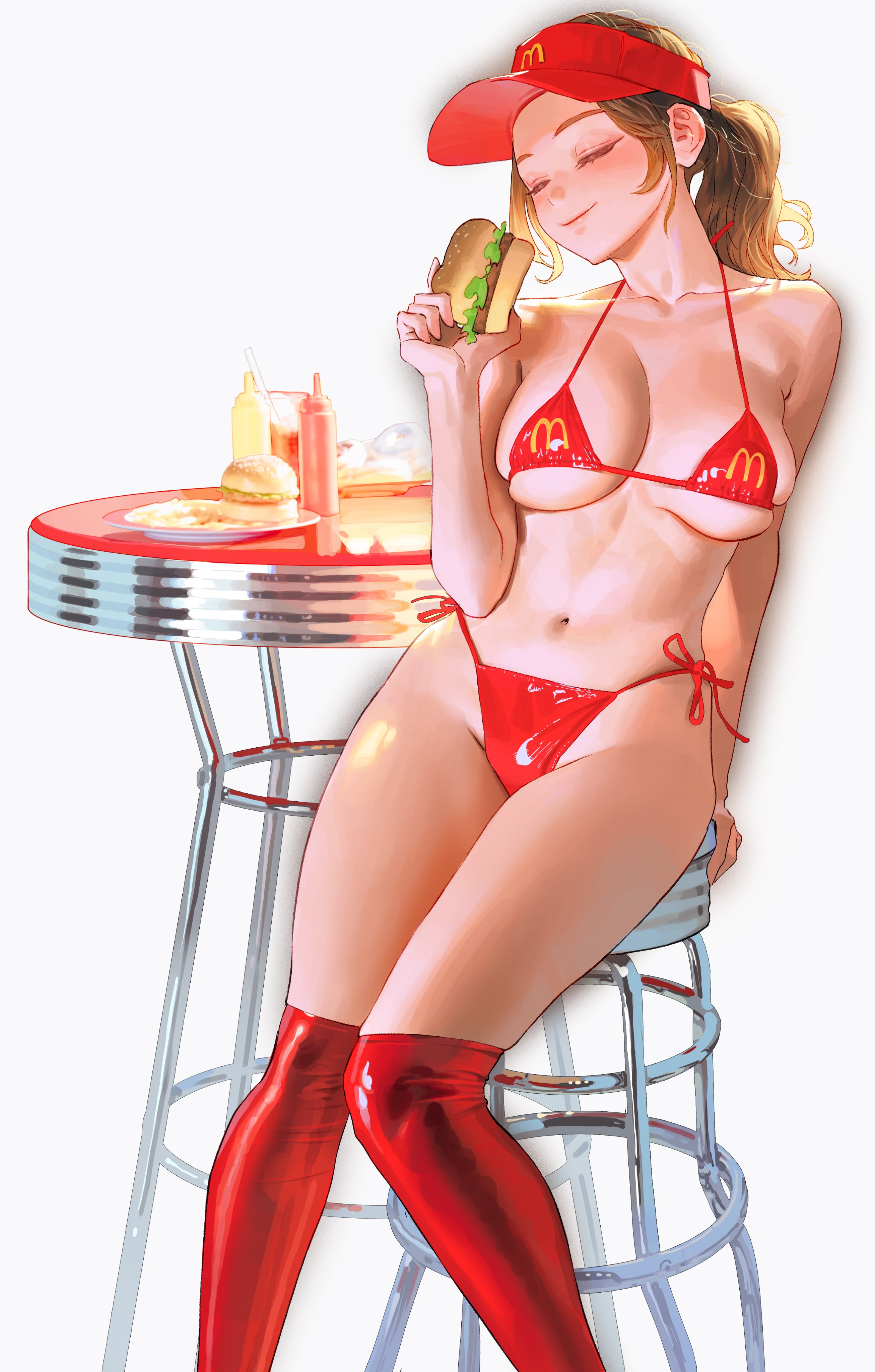 1girlbikinibreastsbrown hairburgerchairclosed eyesclosed mouthcollarbonefoodholdingholding burgerholding foodketchup bottlekneehighslarge breastslatexlatex bikinilatex legwearlong hairmustard bottlenavelon chairplateprint bikinired bikinired socksred visorround tableside-tie bikini bottomsimple backgroundsittingskindentationsmilesockssolostomachswimsuittablethighsvisor capwhite background