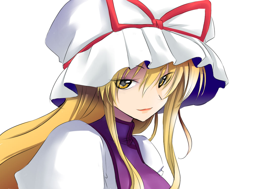 1girlblonde hairfemale focushatlong hairribbonsimple backgroundsmilesoloupper bodywhite backgroundyellow eyes