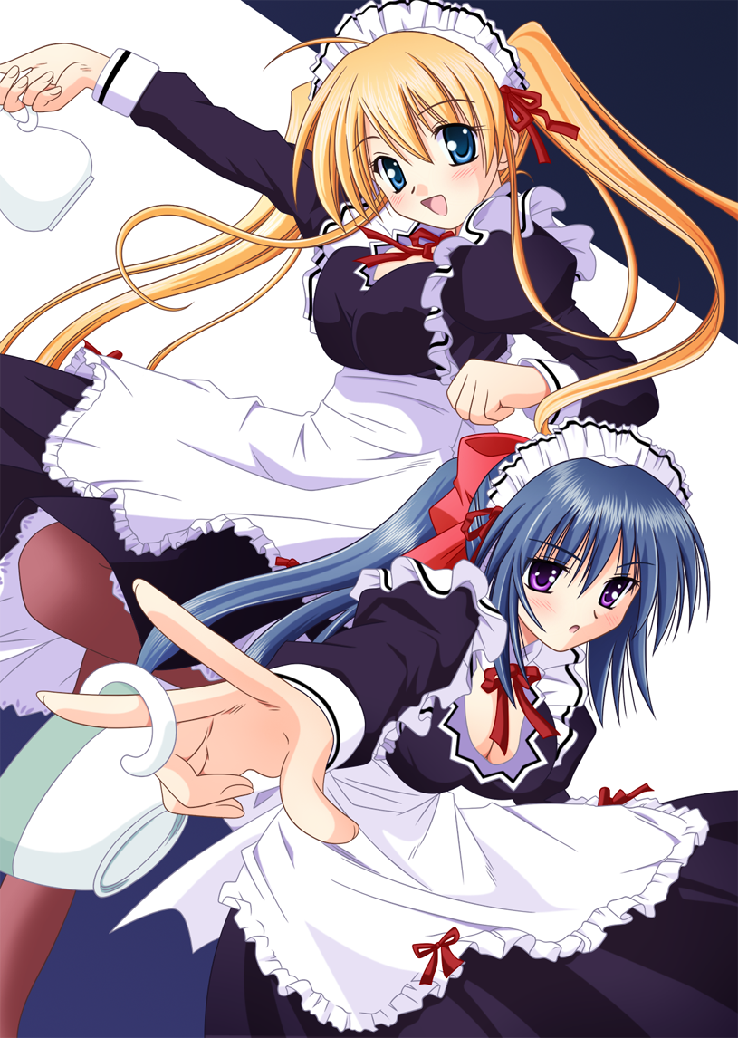 2girlsblonde hairblue eyesblue haircuplong hairmaidmultiple girlspantyhosepurple eyestea setteapottwintails