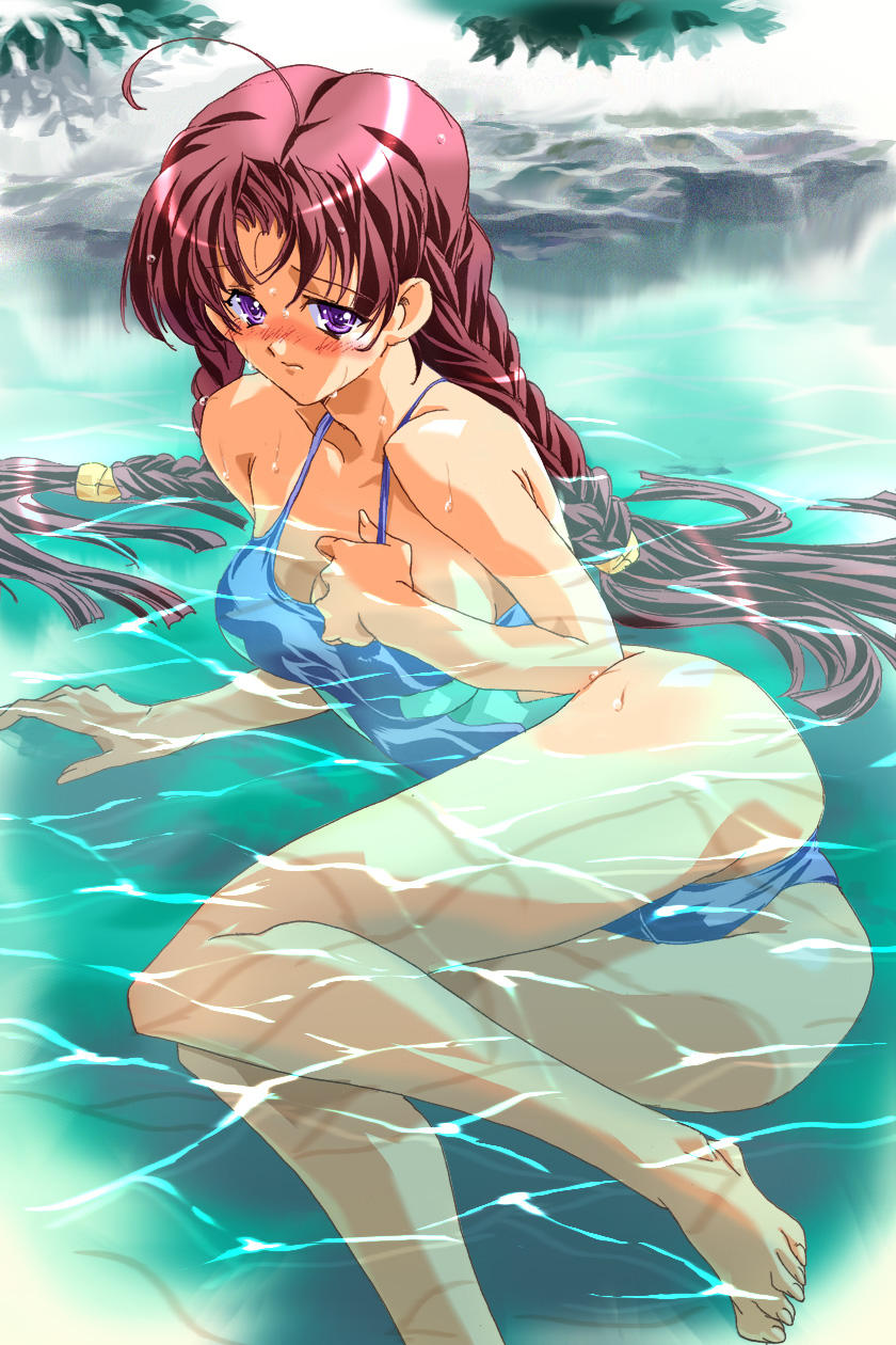 00s1girlassblushbreastscleavagefeetfemale focusone-piece swimsuitpurple eyesred hairsoloswimsuittwintailswater