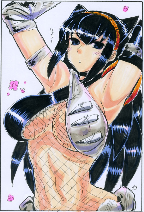 1girlarmorarmpitsblack hairbreastscleavagefemale focusfishnet topfishnetslarge breastsnargacuga (armor)solo