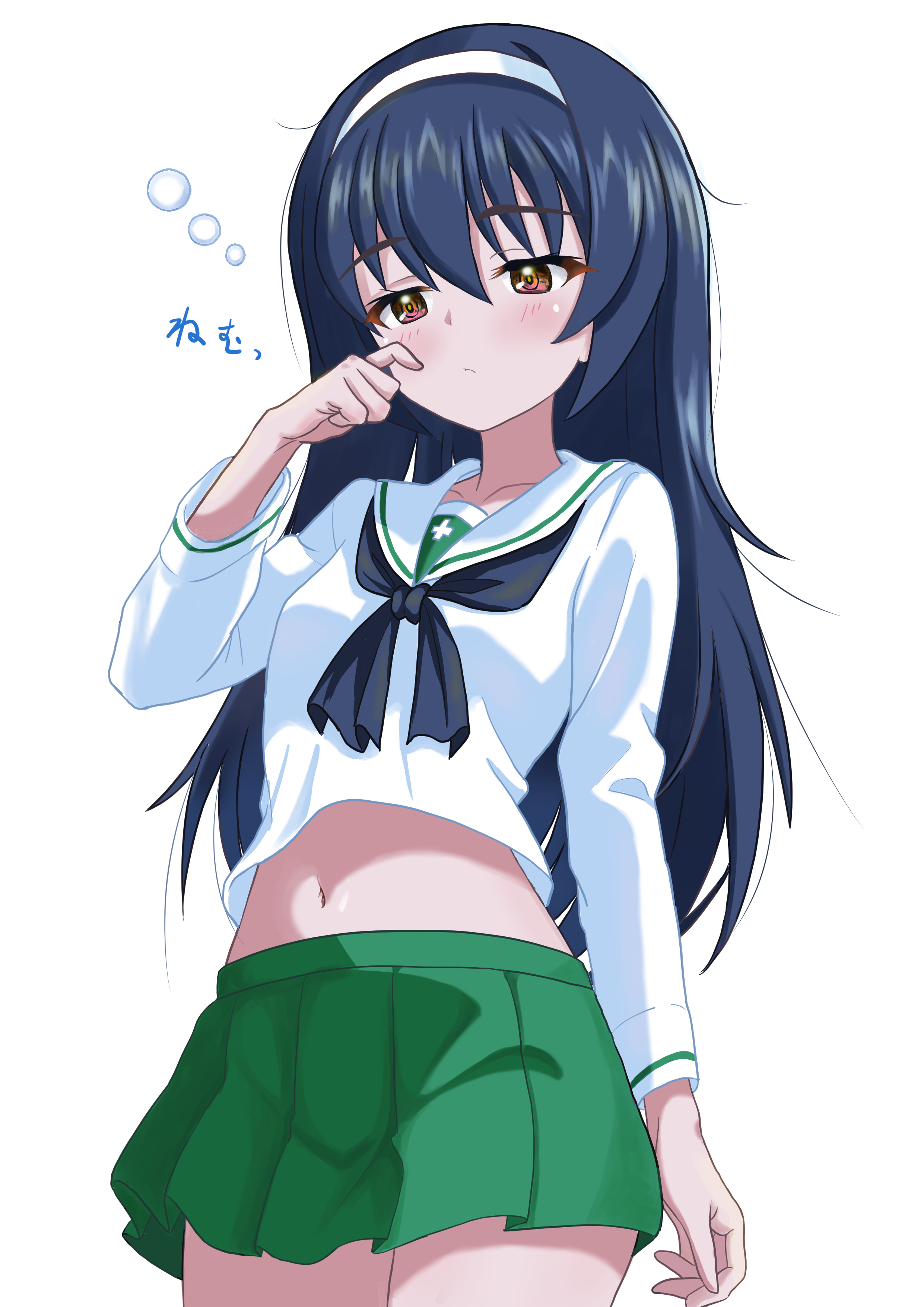 1girlblack hairblushbreastsbrown eyesclosed mouthcollarbonegreen skirthairbandlong hairmidriffminiskirtnavelooarai school uniformpleated skirtschool uniformsimple backgroundskirtsmall breastssolowhite background