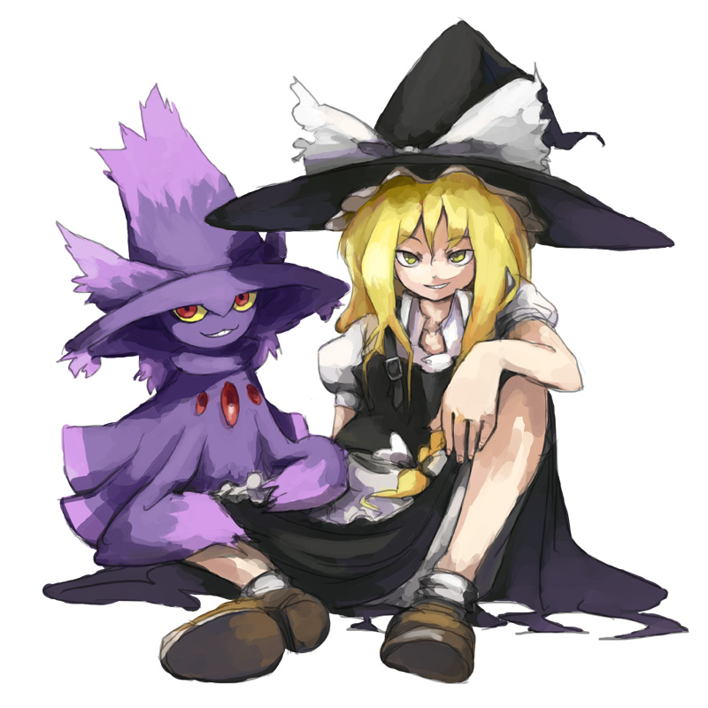 blonde haircrossovergen 4 pokemongrinhatlong hairpokemon (creature)shoe solesshoessittingsmilewitchwitch hatyellow eyes