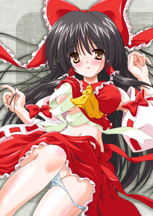 1girlblack hairblushbreastsbrown eyescovered erect nipplesfemale focuspantiesskirtsolounderwear
