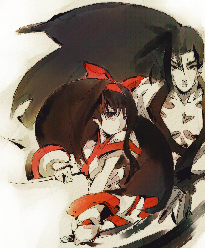 1boy1girlblack hairbowgloveshair bowhairbandhaomarujapanese clotheslong hairred bowreverse gripribbonswordweapon