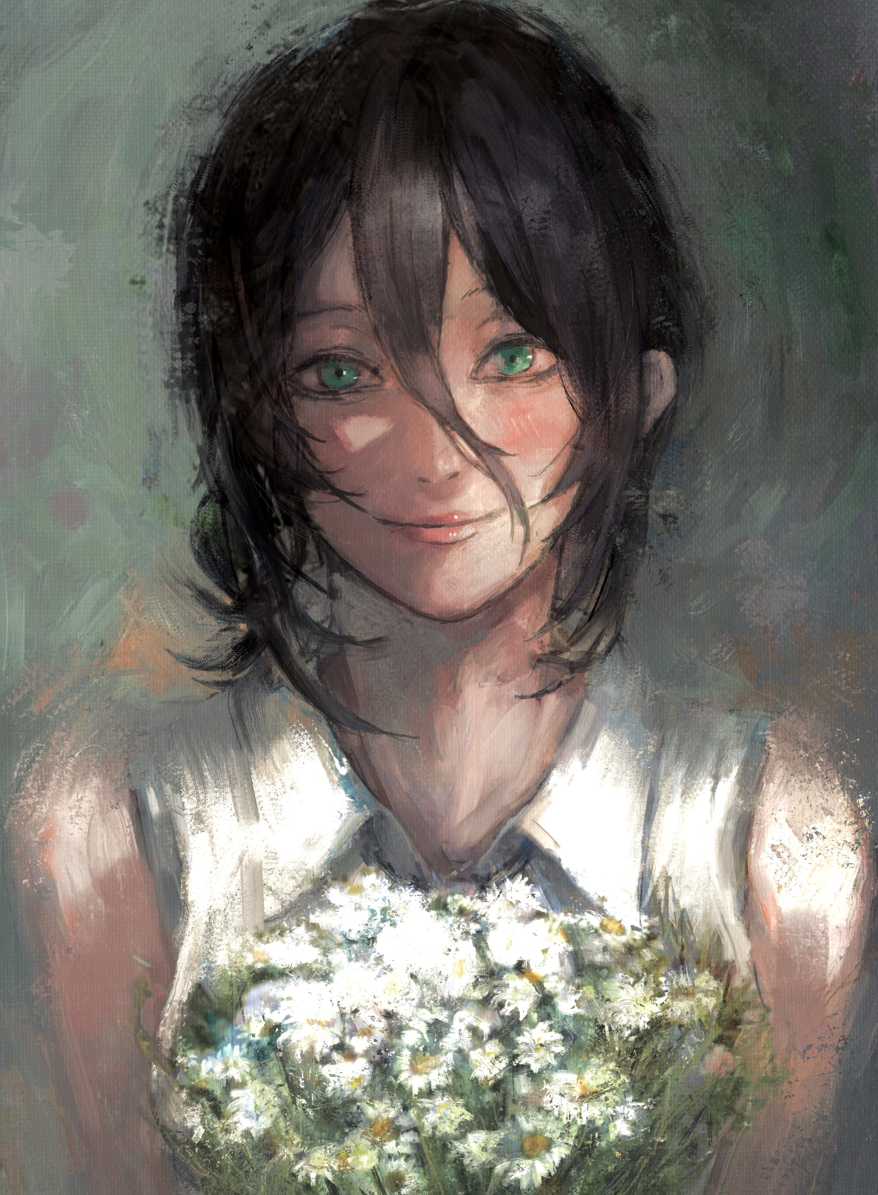 1girlblack hairbouquetcollared shirtdaisy (flower)flowergreen eyeshair between eyesholdingholding bouquetlipslong hair between eyeslooking at viewermedium hairpainterlyshirtsleevelesssleeveless shirtsoloupper bodywhite shirt