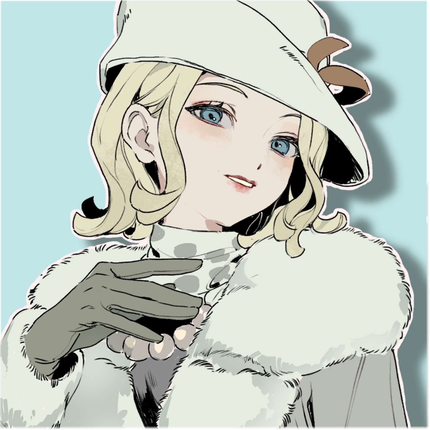 1girlblonde hairblue backgroundblue eyesbob cutbowcoatevelyn morafedorafur trimfur wrist cuffsglovesgrey coatgrey gloveshand uphathat bowhat ribbonjewelrylooking at viewerneckerchiefnecklacepearl necklacepolka dot neckerchiefribbonshort hairsmilesoloupper bodywhite neckerchiefwrist cuffs