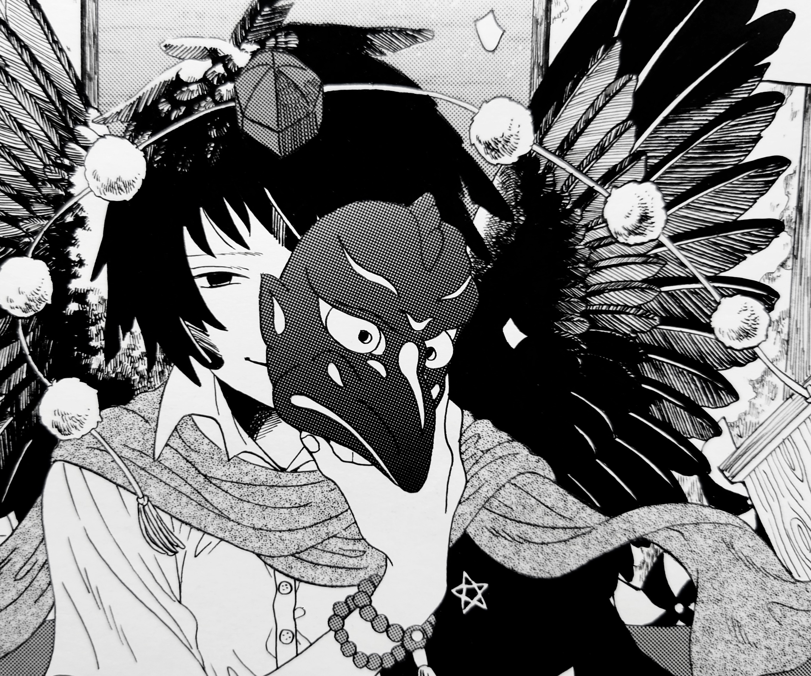 1girlbeadsbraceletbuttonscollared shirtfeather hairfeathered wingsfeathershatholdingholding maskjewelrylooking at viewermaskmonochromepentagrampom pom (clothes)prayer beadsscarshirtshort hairsmiletengutengu masktokin hatwings