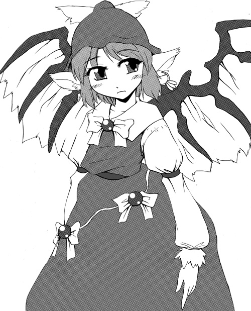 1girlblushdressfemale focusgreyscalelong sleeveslooking at viewermonochromepointy earssimple backgroundsolostandingwhite backgroundwings