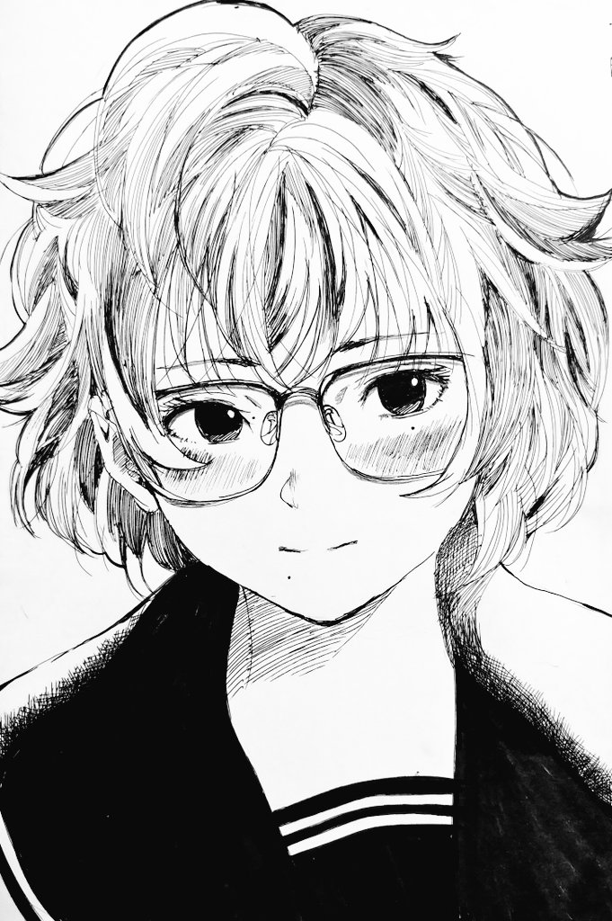 1girlblushglasseslight smilelineartmessy hairmolemole under mouthsailor collarschool uniformshort hairwhite background