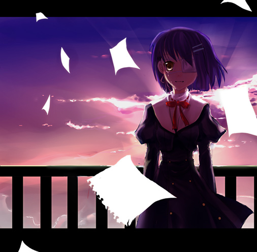 00s1girlblack dressbrown eyesclouddresseyepatchfemale focusfencehair ornamenthaircliplooking at viewerpaperpurple hairrailingred ribbonribbonschool uniformshort hairskysolotearswind
