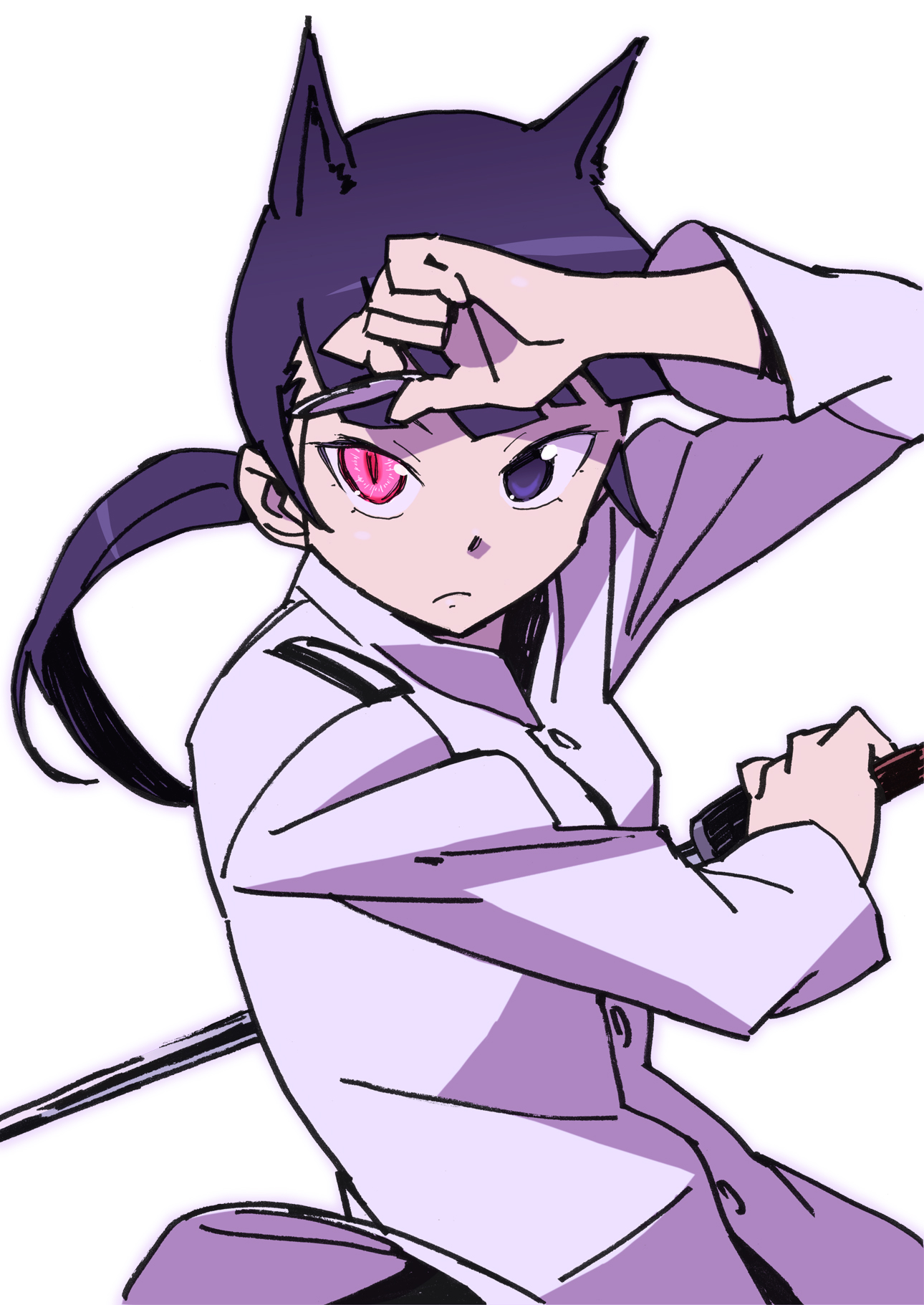 akimaru138, tsukumo ima, tsukumo kako, the hundred line -last defense academy-, commentary, highres, 1boy, 1girl, :d, black bow, black hairband, black sailor collar, blush, bow, bow hairband, bowtie, brother and sister, chibi, chibi inset, double bun, gakuran, glowstick, hair bun, hairband, hand fan, heart, holding, holding fan, jacket, long hair, open mouth, pants, penlight (glowstick), pink background, pink eyes, pink hair, purple eyes, purple hair, red jacket, red pants, red serafuku, red skirt, sailor collar, school uniform, serafuku, short hair, siblings, skirt, smile, twins, twintails, white bow, white bowtie, white streaks