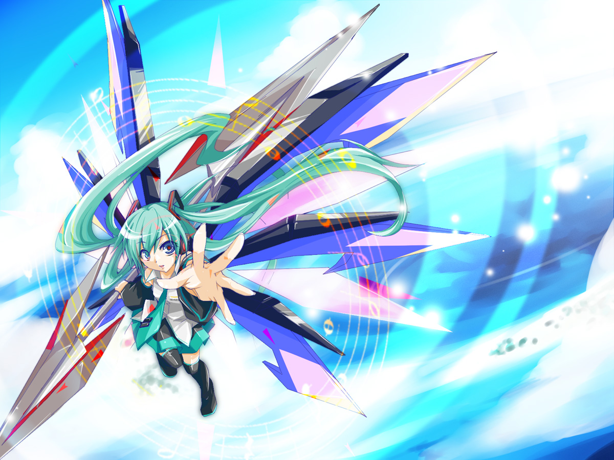 aqua hairblue eyesdetached sleeveslong hairmechanical wingsmusical notenecktieoutstretched armoutstretched handpolearmreachingskirtskysolospearthighhighstwintailsvery long hairweaponwings