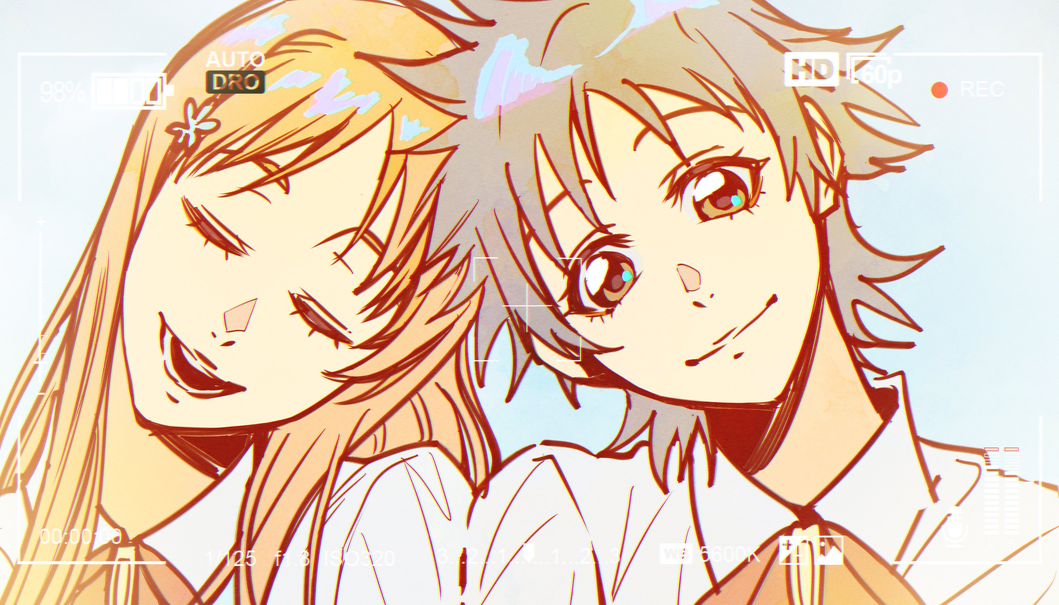 2girlsblack hairblouseclosed eyeshair ornamenthairclipkarakura high school uniformlong hairlooking at viewermultiple girlsopen mouthorange hairribbonschool uniformshirtshort hairsimple backgroundsmile