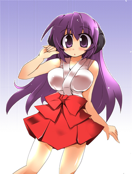 00s1girlblushbreastsfemale focushakamahakama short skirthakama skirthornsjapanese clotheslarge breastslong hairlooking at viewermikopurple eyespurple hairred hakamared skirtskirtsolotaremevery long hair