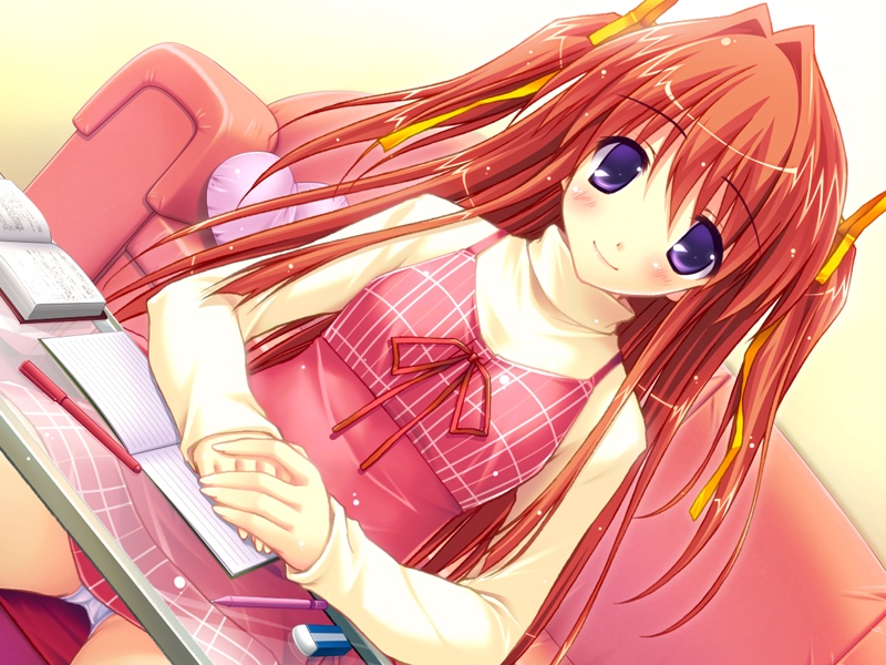 1girlblue eyesblushcouchdutch anglefemale focushair intakeskneelinglong hairpantiespantyshotpurple eyesred hairsolounderwearwhite panties