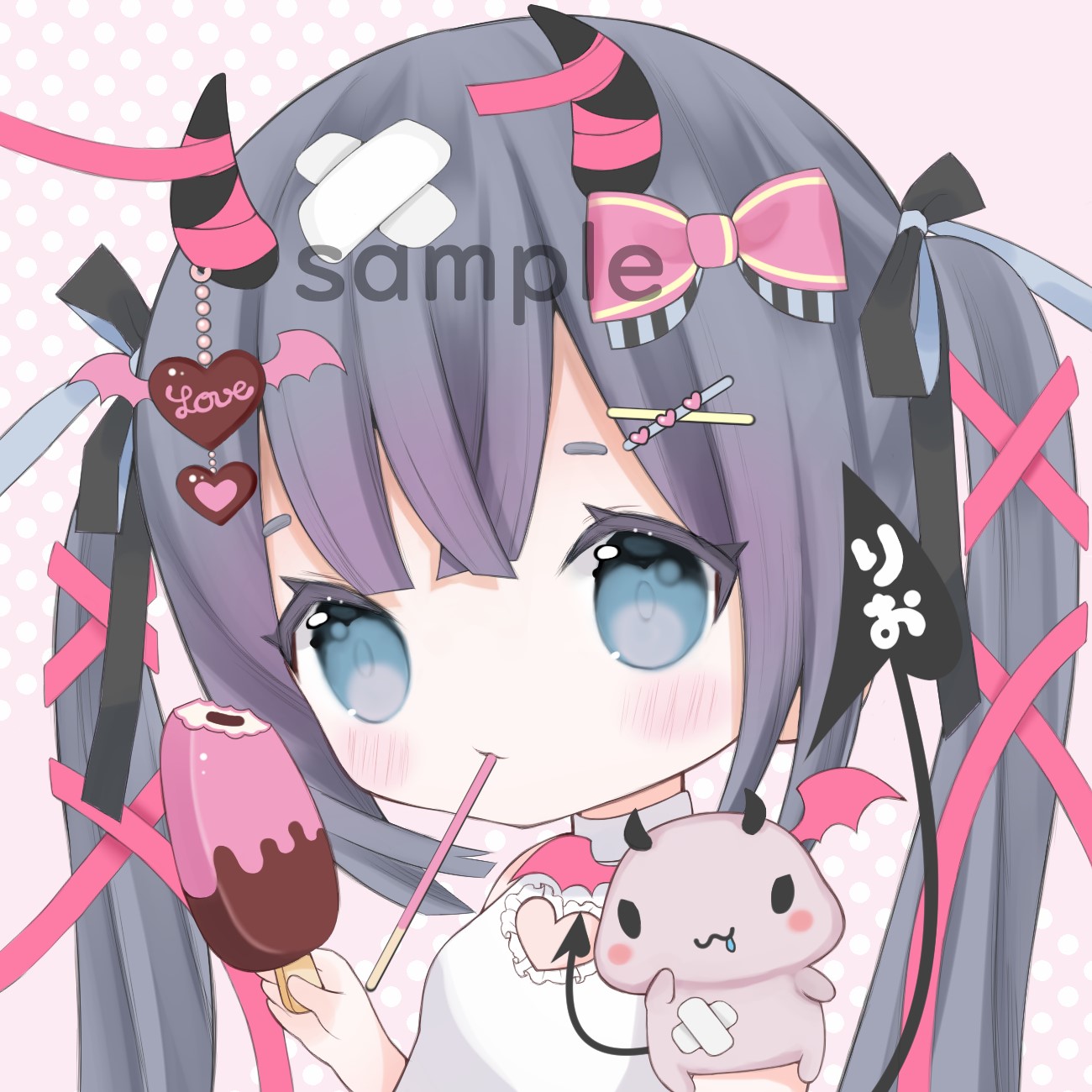 1girlblack hairblue eyesbowdollfashionfoodhair bowhair ornamentholdingholding foodholding popsiclehornslong hairlooking at viewerlow twintailspopsiclerionmelonsimple backgroundsolotwintailsupper body