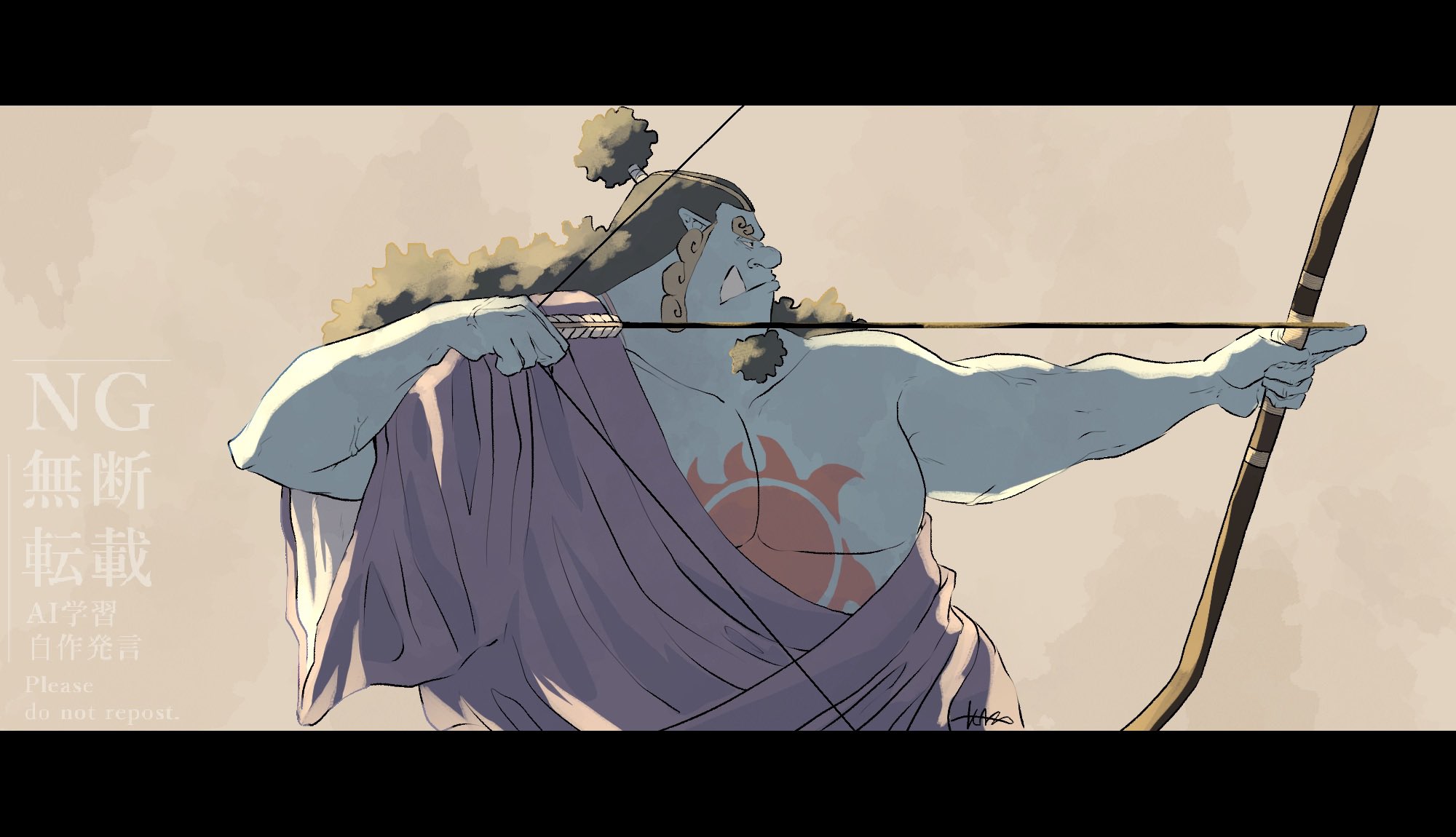 1boyarrow (projectile)black hairblue skinbow (weapon)chest tattoocolored skincurly eyebrowsfacial hairgoateehalf updoholdingholding arrowholding bow (weapon)holding weaponletterboxedlong hairmale focussolotattootusksupper bodyweapon