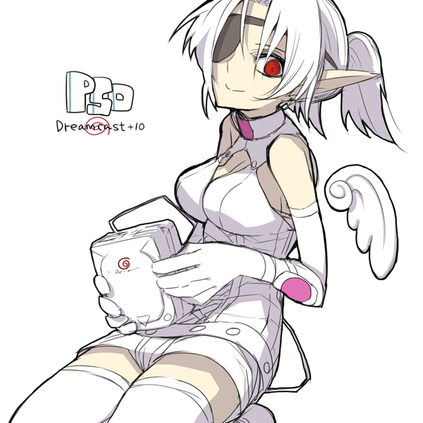 1girlalbinoangel wingsbare shouldersbeltbreastscopyright nameelbow gloveseyepatchfemale focusgame consolegloveslight smilelooking at viewerpointy earsponytailred eyessega dreamcastseizashortssimple backgroundsittingsketchsleevelesssolothighhighswhite backgroundwhite hairwhite themewings