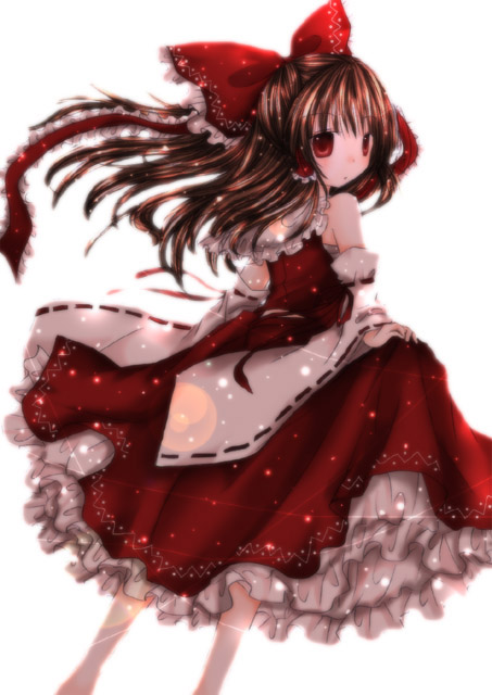 1girlbowbrown hairdetached sleevesdressfemale focusfrom behindhair bowlong sleeveslooking backponytailred dressred eyesribbon trimribbon-trimmed sleevessimple backgroundsolostandingwhite background
