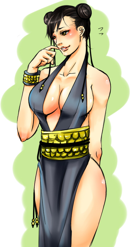 1girlalternate costumeblack hairblushbreastsbrown eyeschina dresschinese clothescleavagedouble bundressfemale focushair bunlarge breastsshort hairsolo