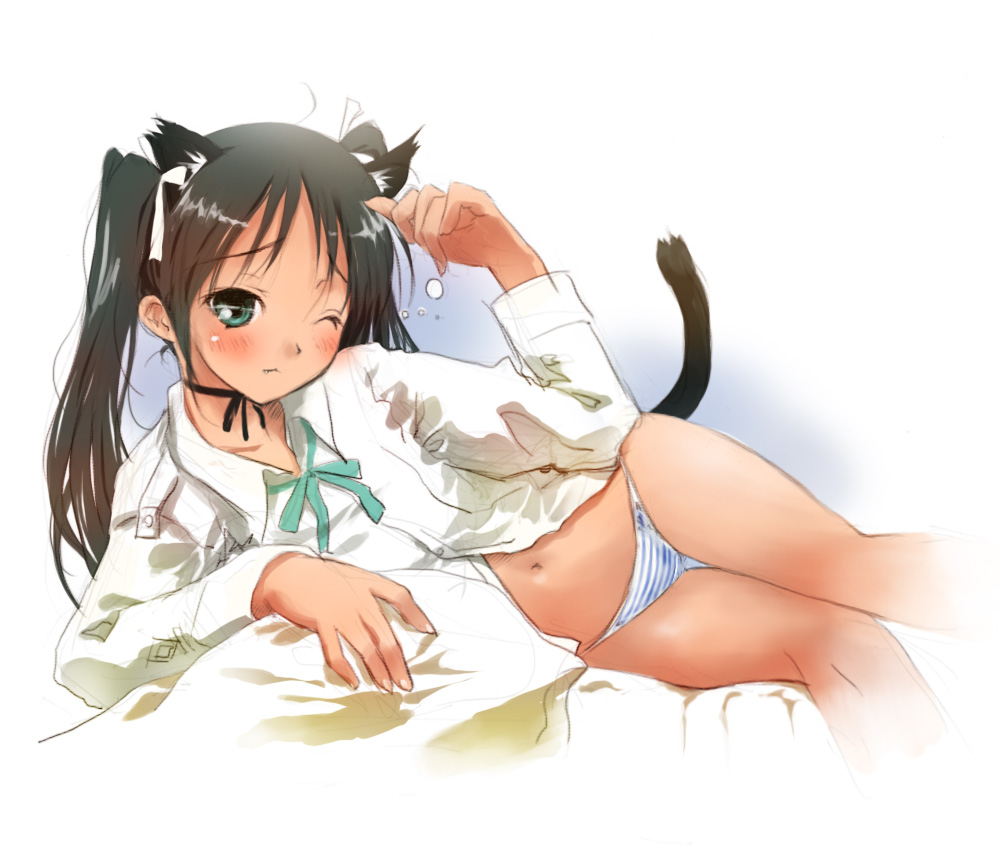 00s1girlanimal earsblack hairblushcat earscat tailclosed mouthfemale focusgreen eyesmidriffnavelone eye closedpantiespillowsolostriped clothesstriped pantiestailtwintailsunbuttonedunderwear