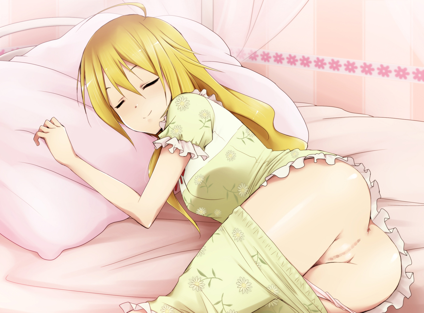 ohizumi daisaku, kusakabe nanami, girigiri love, wallpaper, highres, bed, blush, bow, bow panties, bra, brown eyes, brown hair, hair ribbon, lingerie, lowleg, lowleg panties, lying, navel, on back, panties, panty pull, ribbon, short hair, skirt, skirt pull, strap slip, underwear, yellow panties