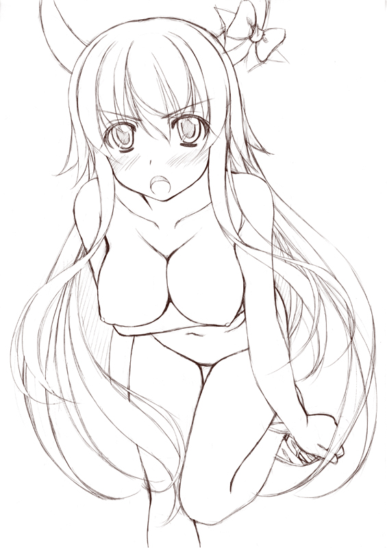 1girlblushbreastsfemale focusfrowngreyscalelong hairmonochromenipplesnudeopen mouthpantiessketchsolounderwearundressingvery long hair
