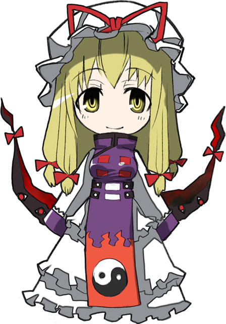 1girlblonde hairbreastschibidressfemale focusgap (touhou)hatlong hairsimple backgroundsmilesolowhite backgroundyellow eyesyin yang