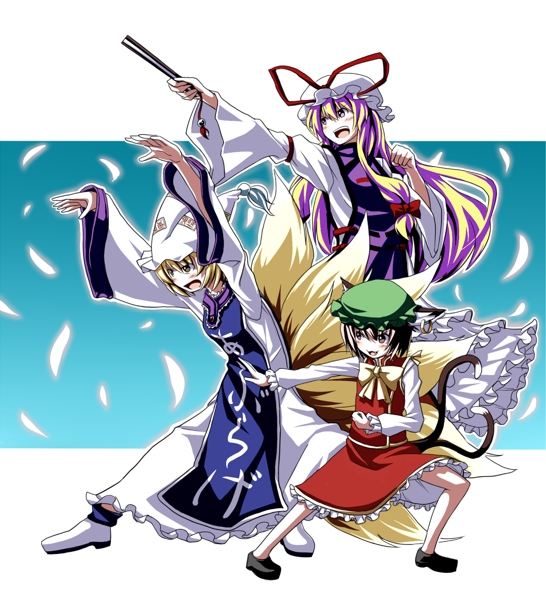 3girlsanimal earsanimal hatblonde haircat earscat girlcat taildressearringsfangfemale focusfighting stancefolded fanfolding fanfox tailhand fanhathat ribbonjewelrylong sleevesmob capmultiple girlsmultiple tailsribbonshoesshort hairtailtasselwide sleeves